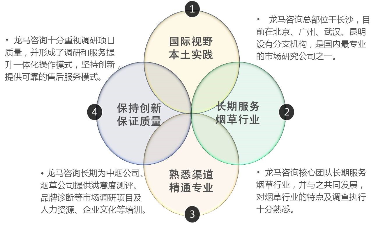 目前,龍馬管理咨詢的服務足跡已遍布北京、山東、遼寧、河南、湖北、湖南、四川、廣東、廣西等全國多個省區,獲得了客戶的充分肯定。公司始終堅守“格物致知、止而至善”的核心價值觀,以豐富的行業經驗和雄厚的專業能力為支撐,為全國卷煙工業企業、商業企業提供包括“顧客滿意度測評”、“品牌診斷研究”、“市場信息采集監測”、“終端盈利水平調查”、“新品定位研究”、“卷煙市場容量預測”等各項專業服務,幫助煙草企業及時了解經營現狀、把握市場信息,從而達成規避市場風險、提升服務質量和經營業績的最終目標。